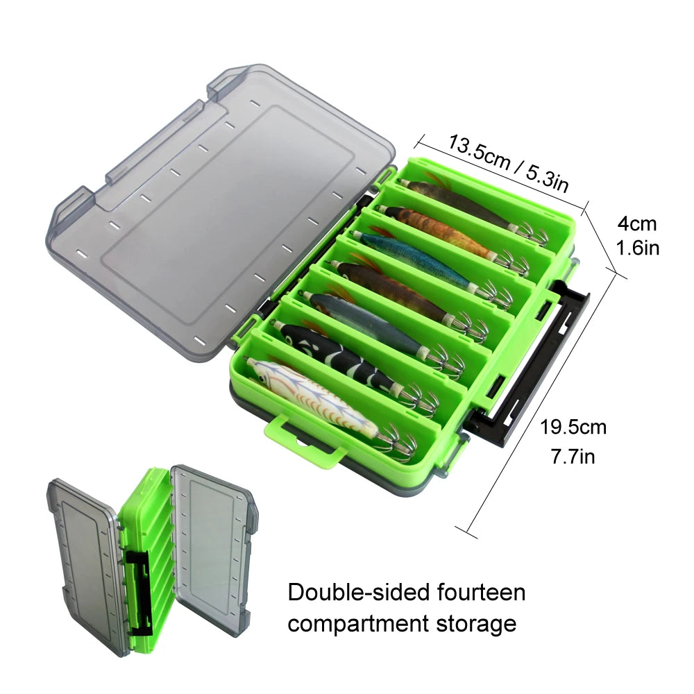 This 14-piece luminous squid jig set is built to deliver consistent results for squid, cuttlefish, and octopus fishing. Featuring a wooden shrimp-style body, each jig maintains a natural horizontal posture and balanced sink rate that closely mimics real prey.