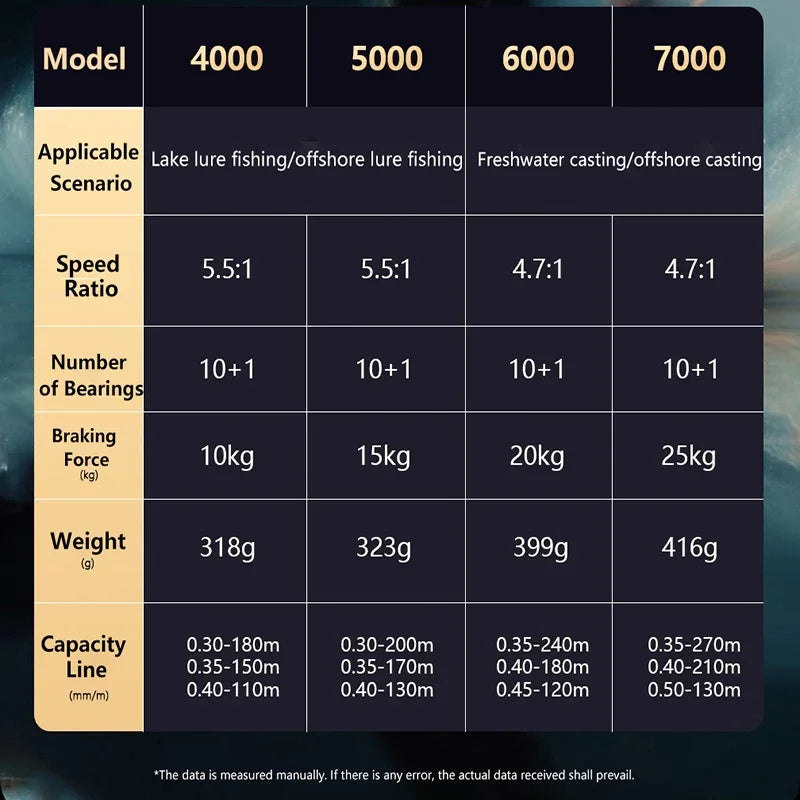 🌀 4000–7000 Size Options – Large line capacity for offshore use