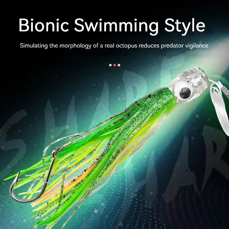 PRO BEROS presents a single squid hook (wood shrimp) designed for big game fishing targeting sailfish, marlin, tuna, wahoo, and more. Available in six vivid color options, it features soft, lifelike tentacles. Measuring 16cm and weighing 45g, this lure is crafted for experienced anglers seeking effective deep-sea trolling tackle.