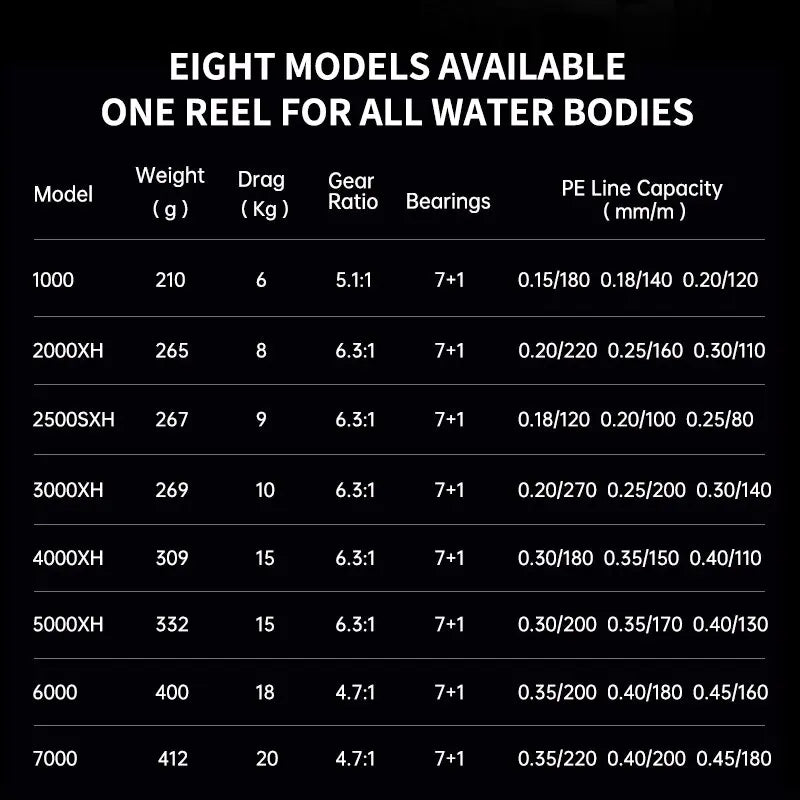 With a massive 20KG max drag, it’s capable of stopping hard-fighting fish with confidence, while the 7+1 ball bearing system ensures smooth, reliable retrieves even during long battles. The metal body and spool construction provide excellent rigidity and durability, making this reel ideal for heavy lure work, bait fishing, and offshore use.