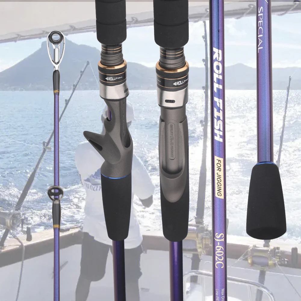 Engineered for serious saltwater anglers, the ROLLFISH Carbon Slow Jigging Rod blends lightweight precision with deep-sea power. Its carbon-fiber blank delivers incredible strength and sensitivity, letting you feel every movement of your jig while keeping control of hard-fighting fish like tuna, kingfish, and bass.