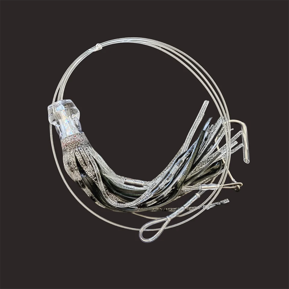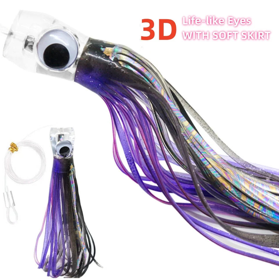 The Swolfy 130g trolling lure with skirts is designed for targeting big game species like marlin, tuna, mahi, dolphin, dorado, wahoo, and shark. It is an essential component in deep sea fishing leader rigs.